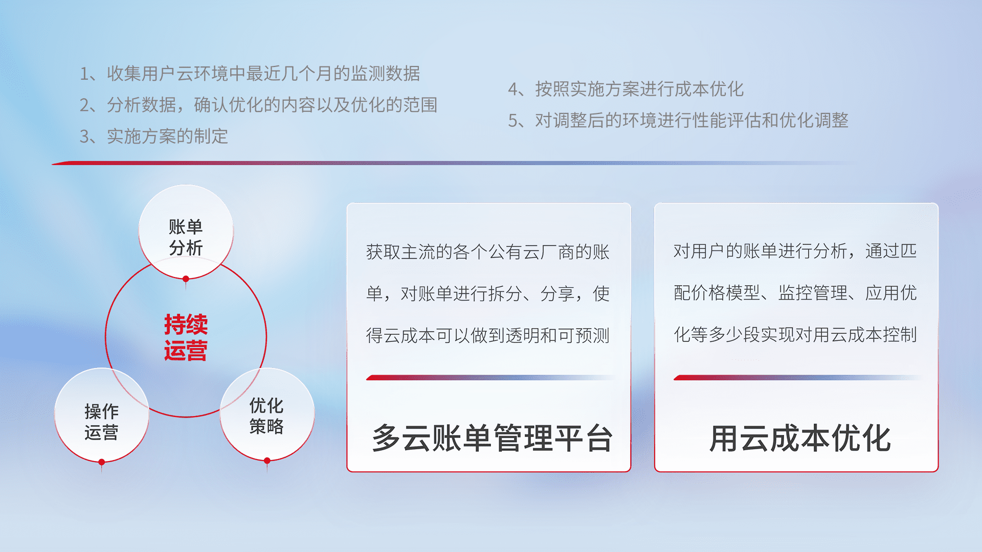 通过多云纳管,,,,以统一的资源数据模型把客户的云资源进行抽象和封装,,,进而实现对多云资源的统一操作,,保障云资源管理的可靠性、、、稳定性与可用性。。。量身定制化运维内容,,,,配置、、开发运维、、、补丁管理、、备份、、、、监控、、认证和访问管理、、、、审计和日常巡检等,,保障在用云过程中的可靠度,,稳定度以及高可用率。。。